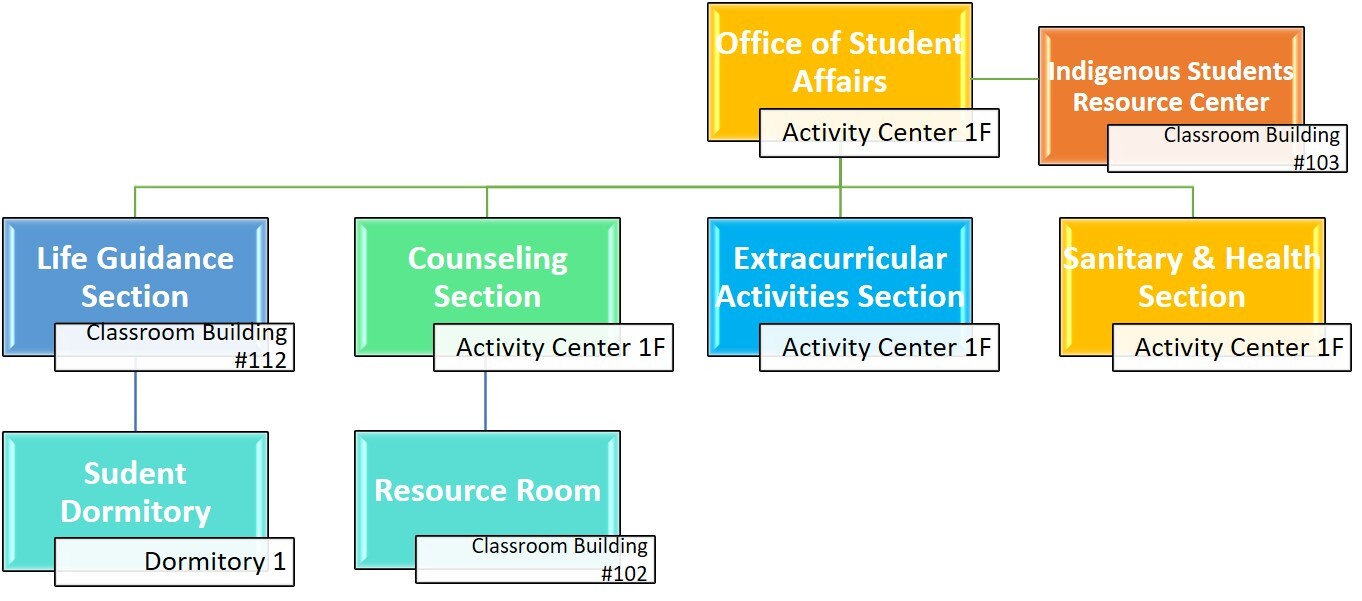 There are four units under the Office of Student Affairs—the Life Guidance Section (including the Dormitory), Counseling Section (including the Resource Room), the Extracurricular Activities Section, the Sanitary & Health Section. Our job dimensions include helping students to adapt to campus life, taking care both student’s mental and physical health, giving guidance to extracurricular activities, student government, manual training, service learning, etc. We play an important role in comprehensive student guidance and character education.